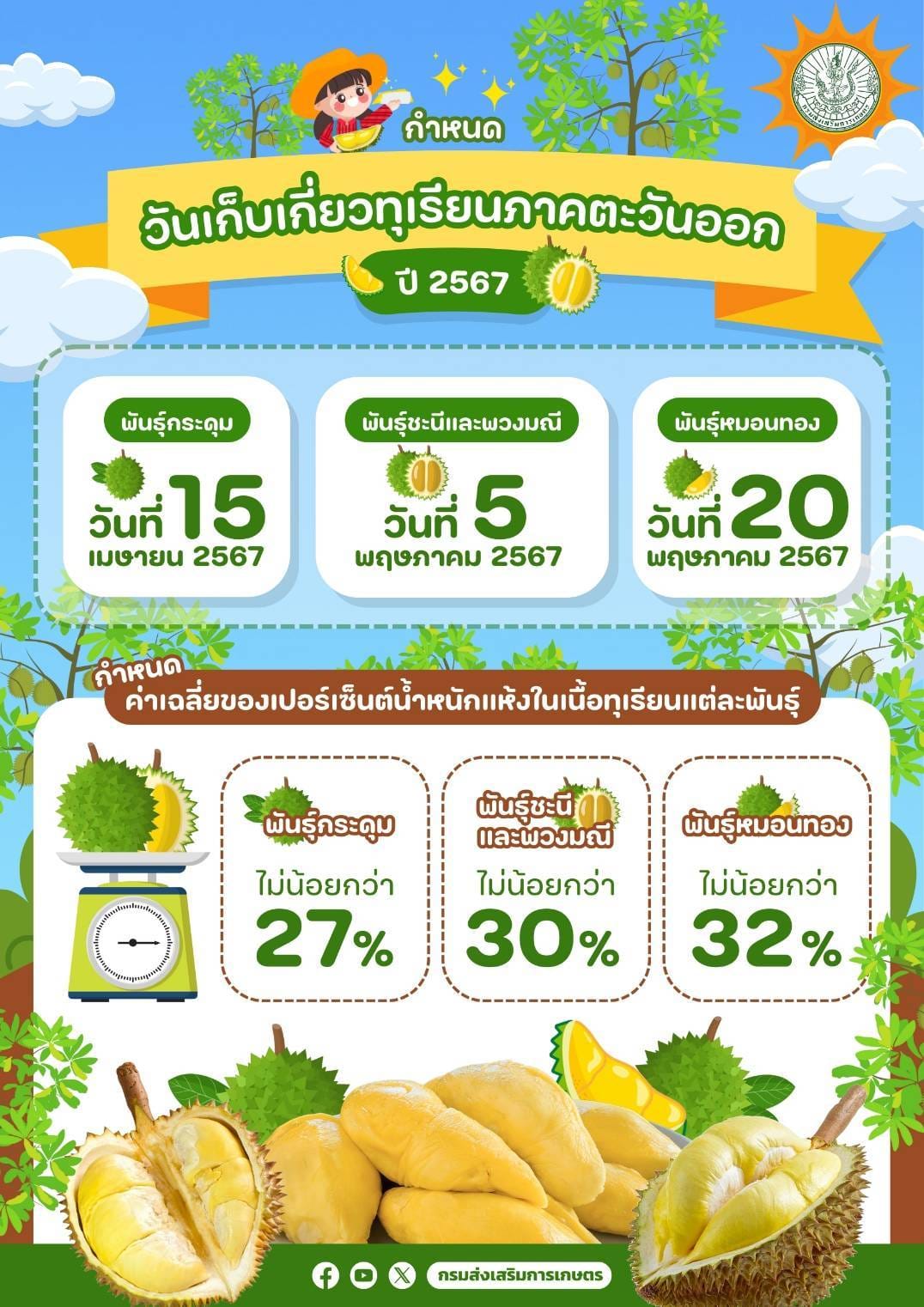 โดยร่วมกับหน่วยงานภาคีทั้งภาครัฐ เอกชน และเกษตรกรวางแนวทางการบริหารจัดการทุเรียนเพื่อการส่งออกภาคตะวันออก กำหนดวันเก็บเกี่ยวทุเรียนภาคตะวันออก ปี 2567 เพื่อใช้เป็นกรอบระยะเวลาในการดำเนินงานตามมาตรการฯ เพื่อให้ผลผลิตทุเรียนที่ออกสู่ตลาดมีคุณภาพ คือ พันธุ์กระดุม วันที่ 15 เมษายน 2567 พันธุ์ชะนี และพวงมณี วันที่ 5 พฤษภาคม 2567 พันธุ์หมอนทอง วันที่ 20 พฤษภาคม 2567 โดยได้กำหนดค่าเฉลี่ยของเปอร์เซ็นต์น้ำหนักแห้งในเนื้อทุเรียนแต่ละสายพันธุ์ไว้ ดังนี้ 1) พันธุ์กระดุม ไม่น้อยกว่า 27 เปอร์เซ็นต์ 2) พันธุ์ชะนี ไม่น้อยกว่า 30 เปอร์เซ็นต์ 3) พันธุ์พวงมณี ไม่น้อยกว่า 30 เปอร์เซ็นต์ และ 4) พันธุ์หมอนทอง ไม่น้อยกว่า 32 เปอร์เซ็นต์ อ้างอิงตามมาตรฐานสินค้าเกษตร เรื่อง ทุเรียน (มกษ. 3-2556)