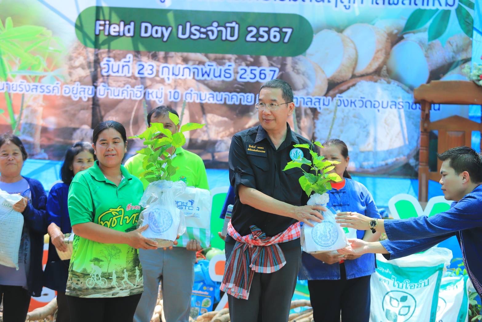 สำหรับวันถ่ายทอดผลงานวิจัยการใช้ปุ๋ยอินทรีย์ตามค่าวิเคราะห์ดินสำหรับมันสำปะหลังอินทรีย์สู่เกษตรกรเพื่อเริ่มต้นฤดูกาลผลิตใหม่ Field Day ประจำปี 2567 ณ แปลงเกษตรกร นายรังสรรค์ อยู่สุข บ้านคำฮี หมู่ 10 ตำบลนาคาย อำเภอตาลสุม จังหวัดอุบลราชธานี ในครั้งนี้ มีความแตกต่างจากการจัดงาน Field Day ที่ผ่านมา โดยมีการนำเสนอผลงานวิจัยและถ่ายทอดเทคโนโลยีการใช้ปุ๋ยอินทรีย์ตามค่าวิเคราะห์ดิน สำหรับมันสำปะหลังอินทรีย์ ภายใต้โครงการ การถ่ายทอดเทคโนโลยีการผลิตมันสำปะหลังในระบบอินทรีย์ด้วยกลไก ตลาดนำการผลิต ด้วยความร่วมมือระหว่าง กรมส่งเสริมการเกษตร โดยสำนักงานเกษตรจังหวัดอุบลราชธานี สำนักงานพัฒนาการวิจัยการเกษตร สำนักงานพัฒนาวิทยาศาสตร์และเทคโนโลยีแห่งชาติ กรมวิชาการเกษตร โดยสำนักวิจัยและพัฒนาการเกษตรเขตที่ 4 อุบลราชธานี และ บริษัทอุบลไบโอเอทานอล จำกัด (มหาชน) โดยมีเป้าหมายเป็นกลุ่มเกษตรกร ตำบลนาคาย อำเภอตาลสุมและตำบลสำโรง อำเภอโพธิ์ไทร จังหวัดอุบลราชธานี กลุ่มเกษตรกรตำบลคูเมือง ตำบลฟ้าหยาด อำเภอมหาชนะชัย จังหวัดยโสธร กลุ่มเกษตรกรตำบลหนองไฮ อำเภอปทุมราชวงศา จังหวัดอำนาจเจริญ จำนวน 160 คน พื้นที่ปลูก 738 ไร่