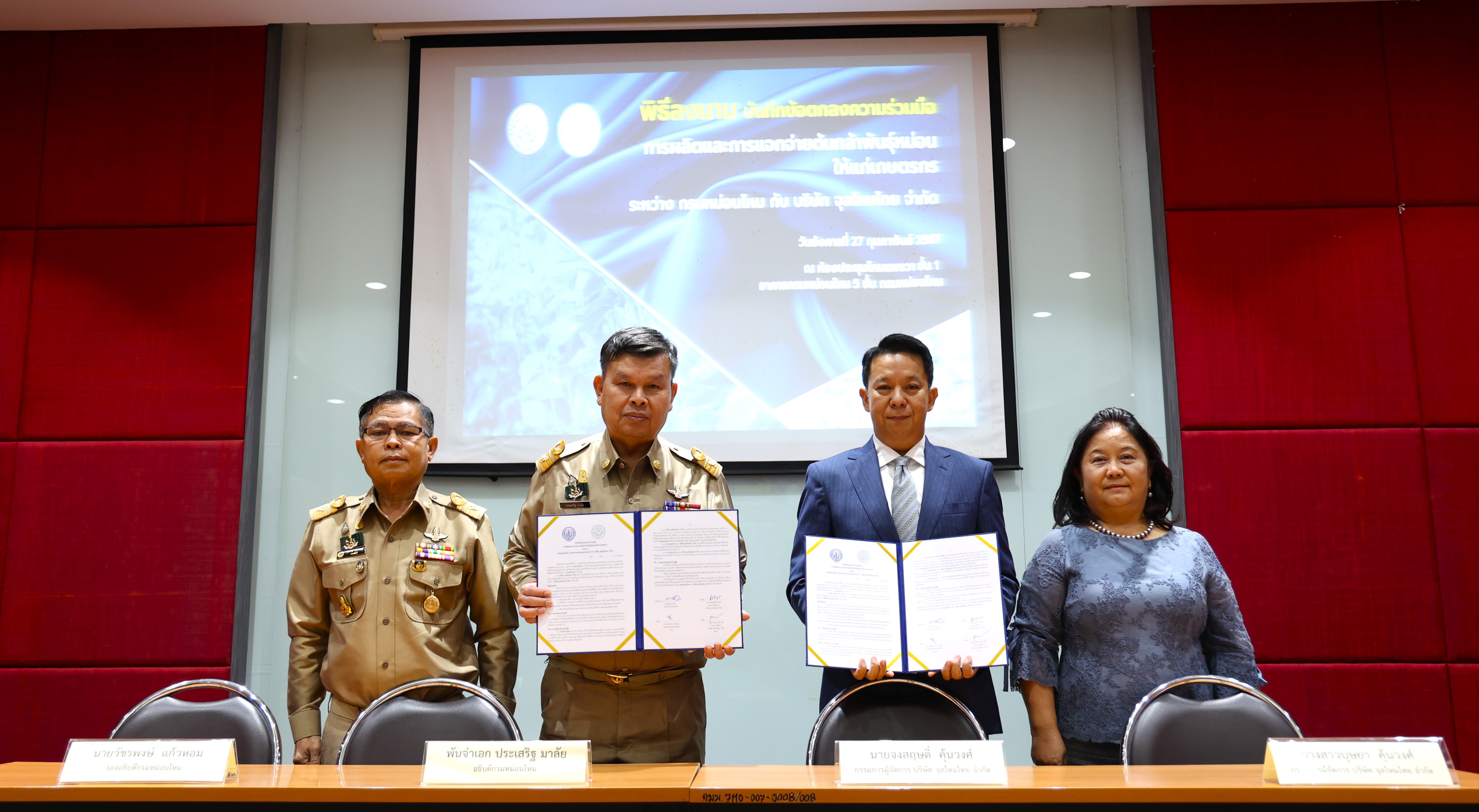 กรมหม่อนไหมได้ลงนามบันทึกข้อตกลงความร่วมมือการผลิตและการแจกจ่ายต้นกล้าพันธุ์หม่อนให้แก่เกษตรกร ระหว่างกรมหม่อนไหมโดย พันจ่าเอก ประเสริฐ มาลัย อธิบดีกรมหม่อนไหม กับบริษัท จุลไหมไทย จำกัด โดยนายจงสฤษดิ์ คุ้นวงศ์ กรรมการผู้จัดการ บริษัท จุลไหมไทย จำกัด