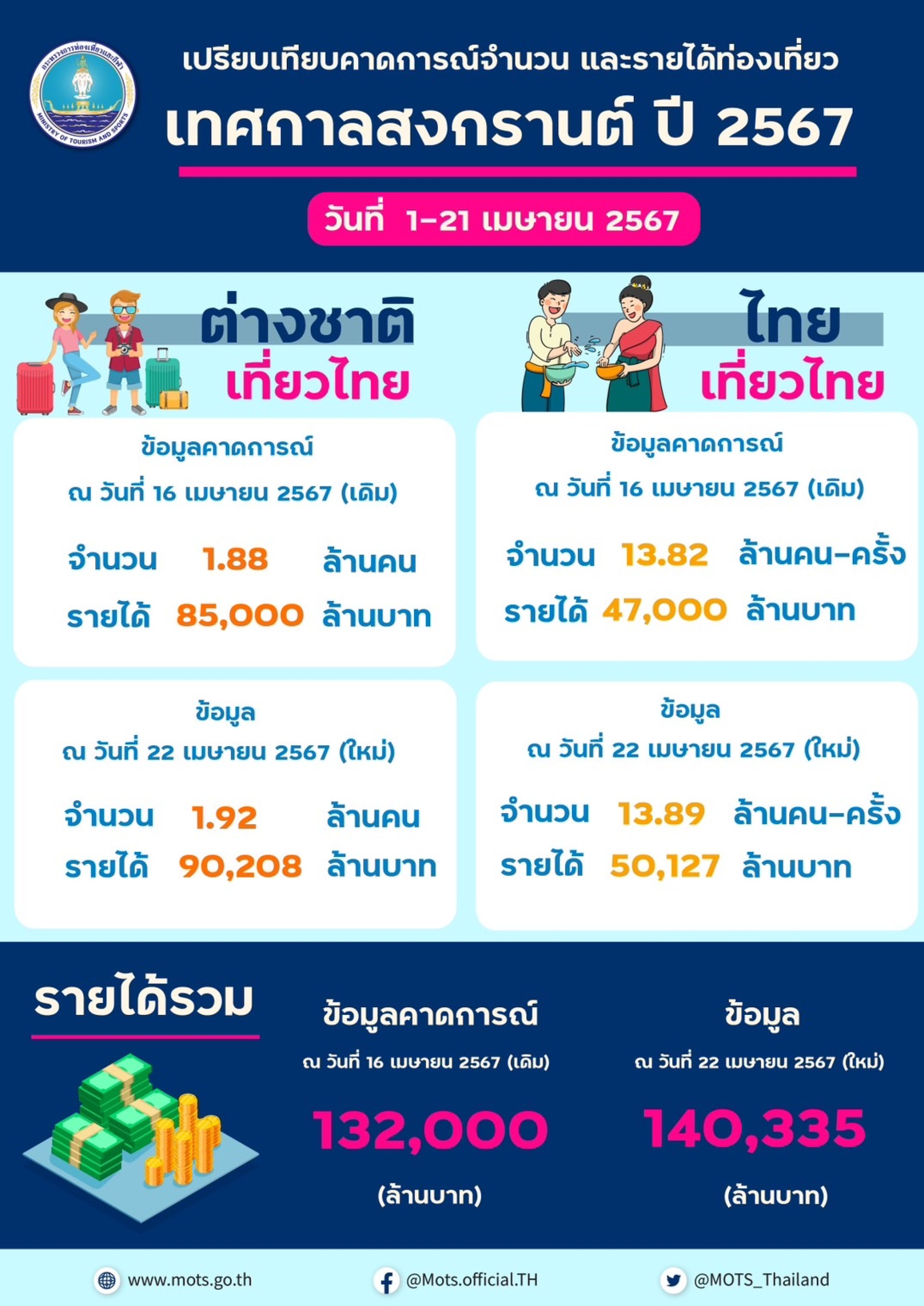 นางสาวสุดาวรรณ หวังศุภกิจโกศล รัฐมนตรีว่าการกระทรวงท่องเที่ยวและกีฬา เปิดเผยว่า กองเศรษฐกิจการท่องเที่ยวและกีฬา ได้สรุปข้อมูลล่าสุดของการท่องเที่ยวของชาวไทยและชาวต่างชาติในช่วงเทศกาลสงกรานต์ ตั้งแต่วันที่ 1- 21 เมษายน 2567 สามารถสร้างรายได้รวม 140,335 ล้านบาท สูงกว่าการประเมินก่อนหน้านี้ที่มีแนวโน้มว่า ในช่วง 21 วันดังกล่าวจะสร้างรายได้รวม 132,000 ล้านบาท โดยในช่วงดังกล่าวมีนักท่องเที่ยวต่างชาติเข้ามาเที่ยวในไทยอย่างคึกคัก ขณะที่คนไทยก็ออกเดินทางท่องเที่ยวและออกมาเล่นน้ำสงกรานต์กันอย่างสนุกสนาน เนื่องจากมีการจัดกิจกรรมทั่วประเทศ