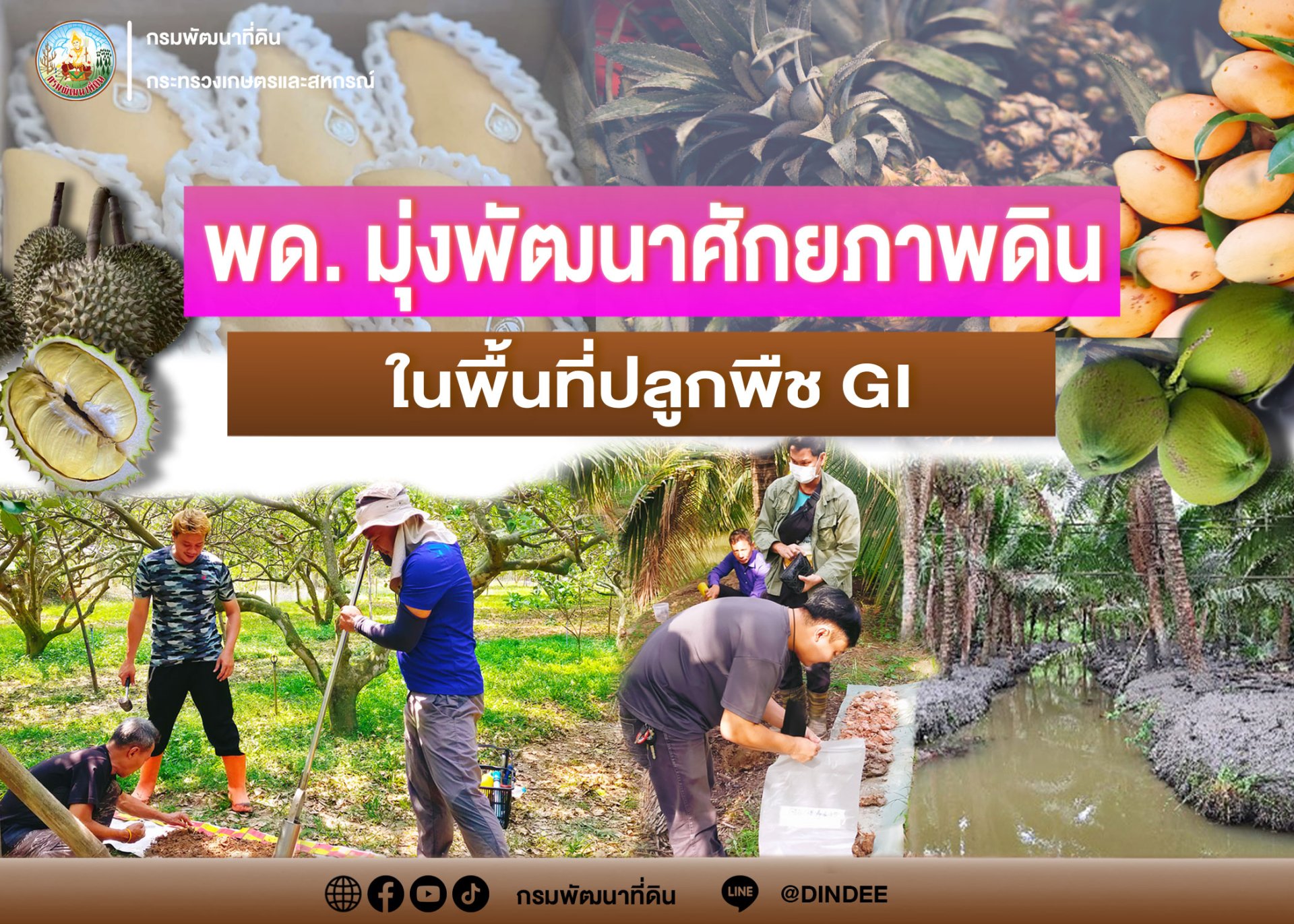 กรมพัฒนาที่ดิน ดำเนินการบริหารจัดการทรัพยากรดินอย่างยั่งยืนในพื้นที่ปลูกพืช GI เพื่อส่งเสริมเกษตรกรเพิ่มมูลค่าสินค้าเกษตรพื้นถิ่น และผลักดันการขยายพื้นที่ปลูกเพิ่มมากขึ้น