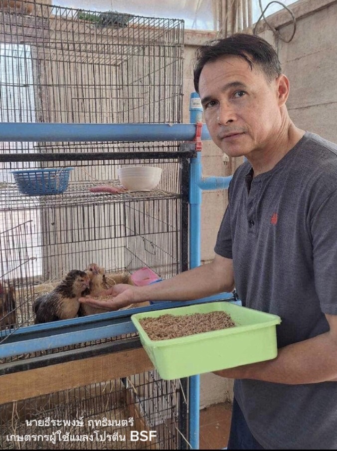 ด้านนายธีระพงษ์ ฤทธิมนตรี เกษตรกรผู้ใช้แมลงโปรตีน BSF กล่าวเสริมว่า ตนเองเปิดฟาร์มเลี้ยงไก่สวยงามมานานกว่า 30 ปีจากเดิมใช้หนอนนกผสมกับหัวอาหารร่วมกับวิตามินเสริมในการเลี้ยง แต่ระยะหลังหนอนนกมีราคาสูงถึงกิโลกรัมละ 500 600 บาททำให้ต้องประสบปัญหาต้นทุนอาหารสูง อีกทั้งต้องประสบปัญหาการป่วยตายของไก่ เนื่องจากเลี้ยงรวมกันในกรงประมาณ 5-6 ตัว ส่งผลให้ไก่เครียดรวมกับภูมิคุ้มกันต่ำทำให้ไก่ตาย ในปี 2566 จึงได้เข้าร่วมอบรมการเลี้ยงแมลงโปรตีน BSF กับทางมหาวิทยาลัยราชภัฎพระนครศรีอยุธยา และนำมาใช้เลี้ยงไก่สวยงาม ด้วยความต้องการที่จะลดต้นทุน ซึ่งเมื่อเลี้ยงได้ 2 เดือน เริ่มเห็นผลชัดเจนว่าสามารถลดต้นทุนด้านอาหารได้จริง จากเดิมต้นทุนเฉลี่ยขั้นต่ำเดือนละประมาณ 15,000 บาท ลดเหลือเพียงเดือนละประมาณ 7,000 บาท และที่สำคัญคือเมื่อเข้า 3 เดือน กลับพบว่าสุขภาพไก่ดีขึ้น โตไวขึ้น ภูมิคุ้มกันสูงขึ้นไม่เจ็บป่วยง่าย ไข่ดี บางตัวที่ไม่ไข่กลับมาไข่ และจากเดิมที่ต้องถ่ายพยาธิทุก 2 เดือน ปัจจุบันไม่ต้องถ่ายพยาธิอีกต่อไปแล้ว ผมจึงมั่นใจว่า แมลงโปรตีน BSF เป็นสิ่งพิเศษที่ไก่ควรได้รับและลดต้นทุนด้านอาหารได้จริงครับ