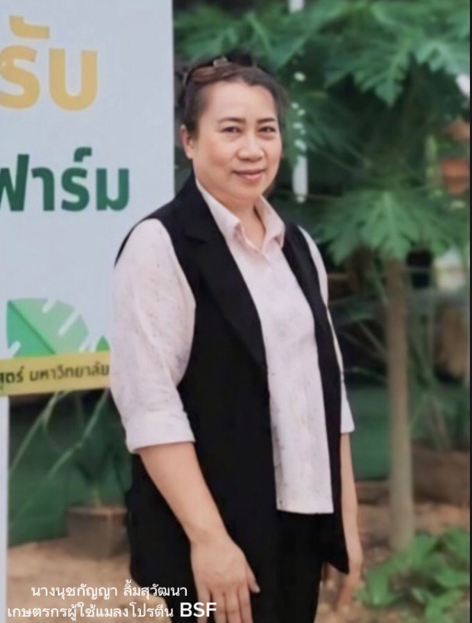 ด้านนางนุชกัญญา ลิ้มสุวัฒนา เกษตรกรผู้ใช้แมลงโปรตีน BSF กล่าวเสริมว่า ตนได้เปิดฟาร์มเลี้ยงจิ้งหรีดทั้งสดและแปรรูป ย้อนกลับไป 3 ปีที่แล้วได้ประสบปัญหาอาหารสำเร็จรูปสำหรับจิ้งหรีดมีราคาสูง 1 กระสอบ 30 กก. ราคา 600 บาททำให้ต้องมองหาอาหารตัวใหม่ที่ให้ประโยชน์เยอะ เสริมภูมิคุ้มกัน และที่สำคัญราคาต้องถูกลงกว่าเดิม จึงได้เข้าไปอบรมการเลี้ยงแมลงโปรตีน BSF และกลับมาลองใช้เลี้ยงจิ้งหรีดในฟาร์ม พบว่าจากเดิมต้องใช้อาหารเดือนละประมาณ 3,000 กก. เป็นเงิน 50,000 60,000 บาท หลังใช้ลดลงเหลือเดือนละประมาณ 30,000 บาท นอกจากนี้ยังพบว่าจิ้งหรีดในฟาร์มแข็งแรงขึ้น โดยเฉพาะช่วงอากาศร้อนพบว่าจิ้งหรีดตายเยอะมาก ซึ่งหลังจากใช้แมลงโปรตีนกลับพบว่าตายน้อยมาก ปัจจุบันทางฟาร์มได้เพาะ BSF ใช้เอง หากเพียงพอก็จะนำบางส่วนไปขาย โดยแต่ละเดือนจะขายได้ประมาณ 10,000 บาท นอกจากนี้ยังมีแผนจะนำมูลหนอนมาทำเป็นปุ๋ยคุณภาพสูงในการเลี้ยงไม้ดอก ไม้ประดับ และพืชผักสวนขายในฟาร์มอีกด้วย