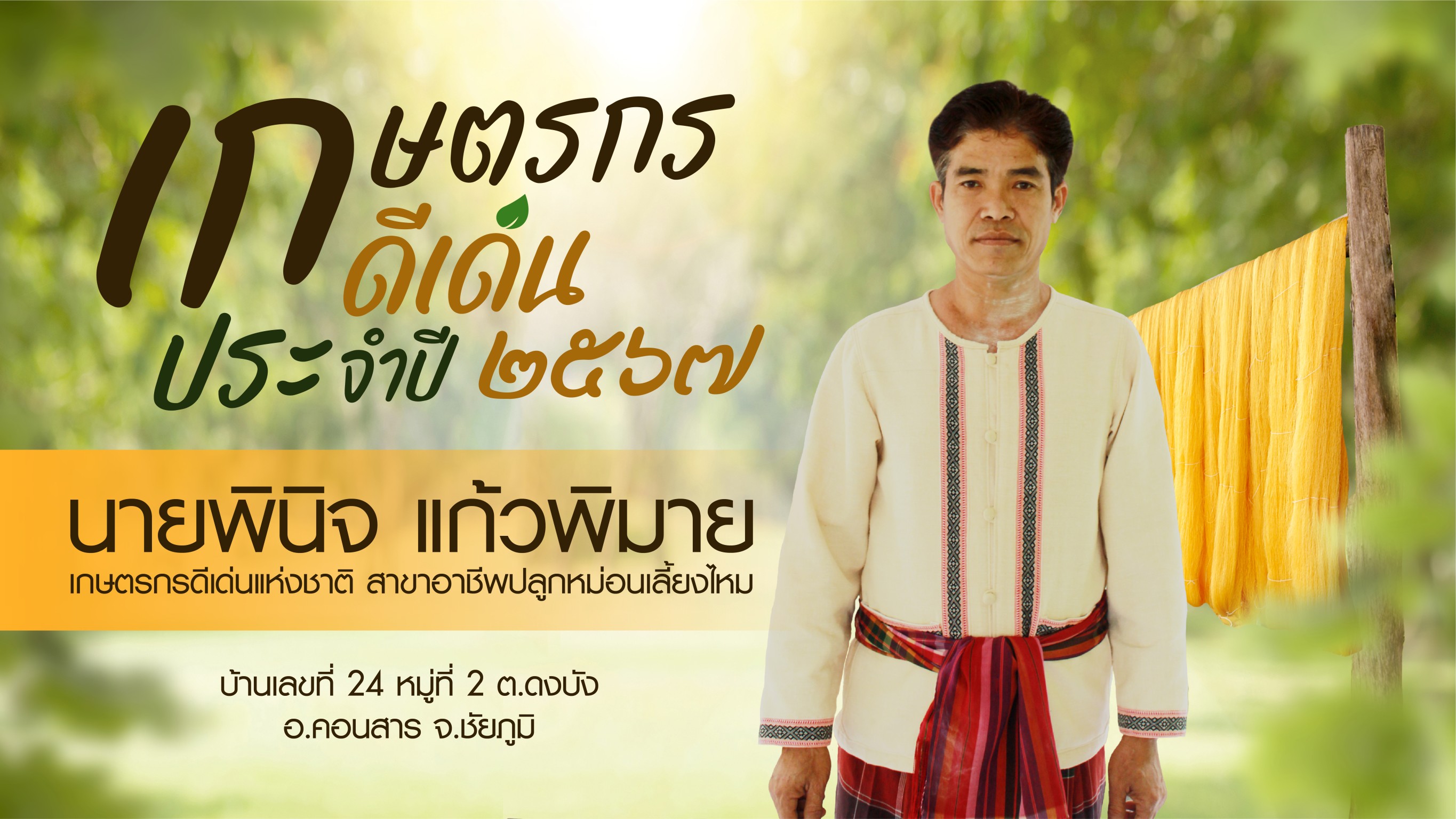 ทั้งนี้กรมหม่อนไหมก็ได้พิจารณาคัดเลือกเกษตรกรสาขาอาชีพปลูกหม่อนเลี้ยงไหม เพื่อเข้ารับพระราชทานโล่รางวัลดังกล่าวในปีนี้ โดยเกษตรกรผู้ที่ผ่านการคัดเลือก คือ นายพินิจ แก้วพิมาย เป็นเกษตรกรสาขาอาชีพปลูกหม่อนเลี้ยงไหม ในพื้นที่ที่บ้านดงบัง ตำบลดงบัง อำเภอคอนสาร จังหวัดชัยภูมิผลงานแต่เดิม ครอบครัวนายพินิจ ทำอาชีพปลูกหม่อนเลี้ยงไหมมาตั้งแต่รุ่นบรรพบุษ จึงได้เรียนรู้จากช่วยแม่เลี้ยงไหมตั้งแต่ตอนเรียนชั้นประถมศึกษาปีที่ 4 ทำให้ซึมซับ จนรู้สึกชอบและผูกพันธ์ จากความคุ้นเคยและเรียนรู้จากที่เคยช่วยแม่ทำสั่งสมประสบการณ์ จนกระทั่งอายุ 20 ปี ก็เริ่มหันมาปลูกหม่อนเลี้ยงไหม สาวไหม และทอผ้าเองแบบจริงจัง จนสามารถทำได้แบบครบวงจรตั้งแต่ต้นน้ำถึงปลายน้ำ คือ ปลูกหม่อนเลี้ยงไหมสาวไหมและทอผ้าไหมในพื้นที่ 2.5 ไร่ ด้วยความใส่ใจในการดูแลแปลงปลูกหม่อนตั้งแต่การใส่ปุ๋ยบำรุงดินให้น้ำตัดแต่งกิ่งตามหลักวิชาการที่ได้รับคำแนะนำจากกรมหม่อนไหมทำให้ได้ผลผลิตใบหม่อนทั้งพันธุ์บุรีรัมย์ 60 และพันธุ์สกลนครถึงปีละ 8 ตัน โดยยึดเป็นอาชีพหลักมาจนถึงปัจจุบันรวม29 ปีแล้ว