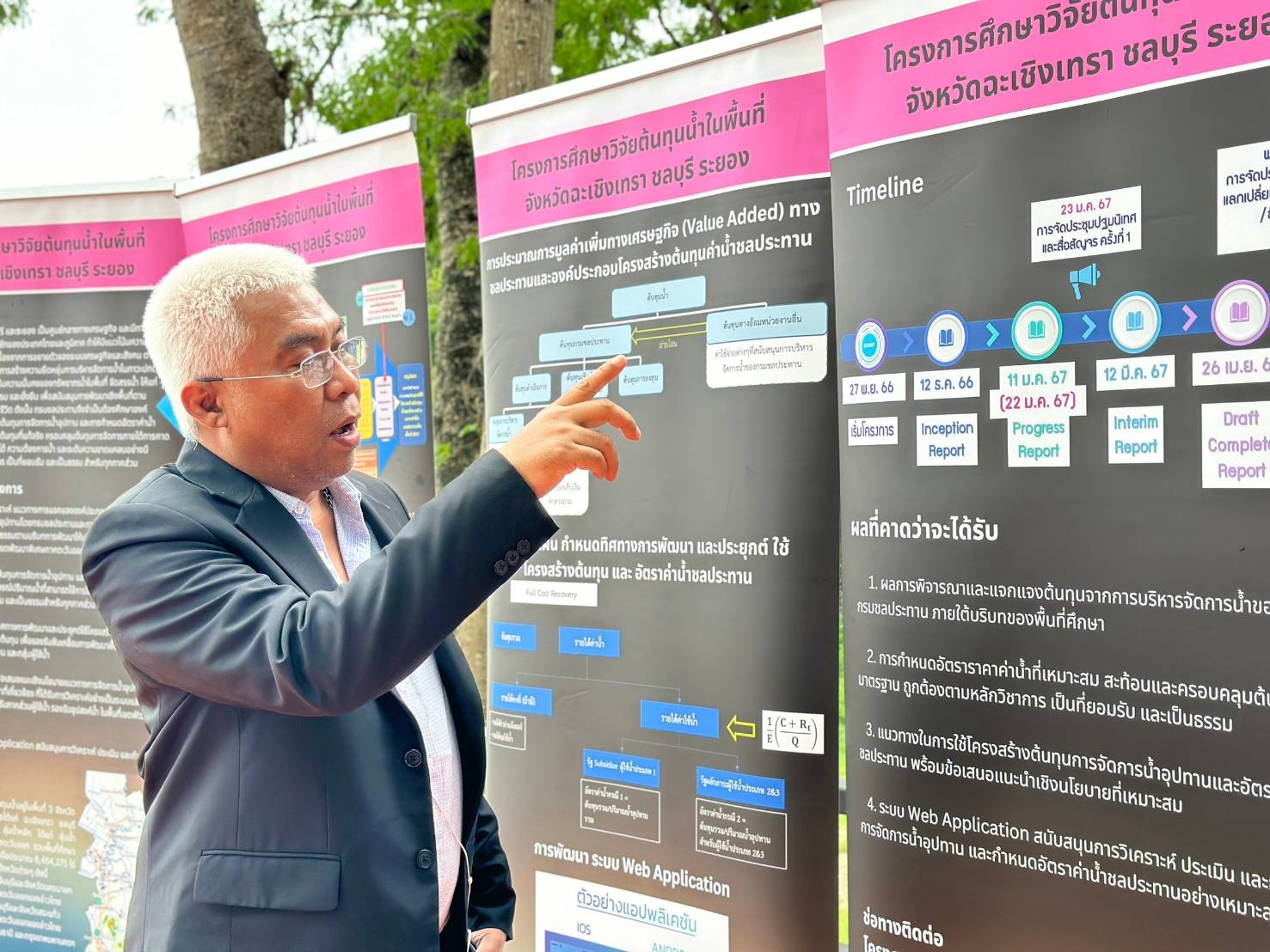 โดยคณะผู้เชี่ยวชาญได้ทำการศึกษาวิเคราะห์ต้นทุนค่าน้ำและกำหนดข้อเสนอแนะเชิงนโยบายแนวทางการจัดการน้ำอุปทานอย่างเหมาะสมสอดคล้องกับภาคส่วนผู้ใช้น้ำที่เกี่ยวข้อง ที่ได้รับการวิเคราะห์อย่างเป็นระบบแล้วให้มีประสิทธิภาพทางเศรษฐกิจ และรองรับอุปสงค์น้ำจากการคาดการณ์บริบทการเปลี่ยนแปลงในอนาคตและพัฒนาระบบ Web Application สนับสนุนการวิเคราะห์ ประเมิน และกำหนดต้นทุนการจัดการน้ำอุปทานและกำหนดต้นทุนการจัดการน้ำ กำหนดอัตราค่าน้ำชลประทานอย่างเหมาะสม ภายใต้การคาดการณ์ปริมาณน้ำที่สามารถใช้การได้ ความต้องการน้ำและระดับความขาดแคลนอย่างมีมาตรฐานและเป็นธรรมสำหรับทุกภาคส่วนในเป้าหมาย 3 จังหวัดคือฉะเชิงเทรา ชลบุรีและระยอง คาบเกี่ยวกับ2ลุ่มน้ำหลัก ได้แก่ ลุ่มน้ำบางปะกงและลุ่มน้ำชายฝั่งทะเลตะวันออกรวมพื้นที่ศึกษาทั้งหมดประมาณ8,454,375ไร่