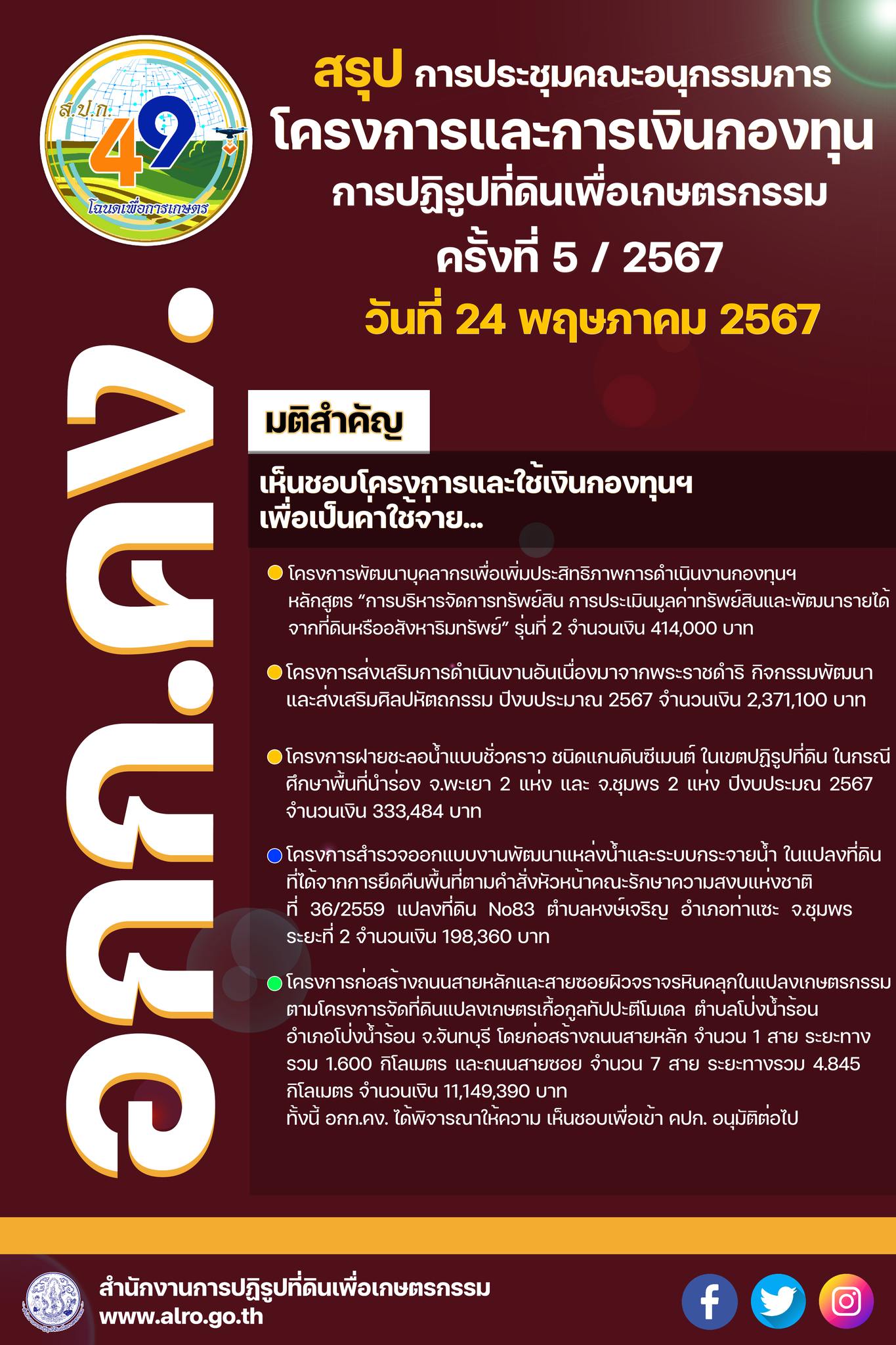 นอกจากนั้นยังมีการขออนุมัติโครงการและใช้เงินกองทุนฯ เพื่อเป็นค่าใช้จ่ายโครงการก่อสร้างถนนสายหลักและสายซอยผิวจราจรหินคลุกในแปลงเกษตรกรรม ตามโครงการจัดที่ดินแปลงเกษตรเกื้อกูลทัปปะตีโมเดล ตำบลโป่งน้ำร้อน อำเภอโป่งน้ำร้อนจ.จันทบุรี โดยก่อสร้างถนนสายหลัก จำนวน ๑ สาย ระยะทางรวม ๑.๖๐๐ กิโลเมตร และถนนสายซอย จำนวน ๗ สาย ระยะทางรวม ๔.๘๔๕ กิโลเมตร จำนวนเงิน ๑๑,๑๔๙,๓๙๐ บาท ทั้งนี้ อกก.คง. ได้พิจารณาให้ความเห็นชอบเพื่อเข้า คปก. อนุมัติต่อไป และยังได้อนุมัติค่าใช้จ่ายเพื่อการจัดซื้อและอนุมัติราคาที่ดินในท้องที่ตำบลปากู อำเภอทุ่งยางแดง และตำบลกะดุนง อำเภอสายบุรี จ.ปัตตานี จำนวน ๗ ราย ๑๐ แปลง เนื้อที่ประมาณ ๒๐๕-๐-๕๔.๗๐ ไร่ วงเงินจัดซื้อทั้งสิ้น ๒๐,๐๒๐,๓๒๕ บาท และที่ดินตำบลตรีณรงค์ ตำบลระไว และตำบลจรเข้ร้อง อำเภอไชโยจ.อ่างทอง จำนวน ๓ ราย ๓ แปลง เนื้อที่ประมาณ ๒๑-๒-๒๐.๓๐ ไร่ วงเงินจัดซื้อทั้งสิ้น ๓,๔๐๖,๕๘๘.๗๕ บาท